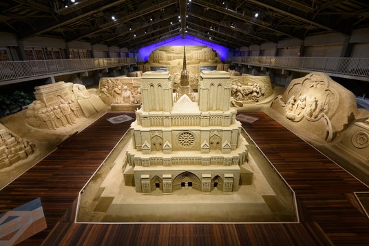 砂の美術館では、毎年テーマを替えて砂像の展示をおこなっており、現在はパリ五輪にちなみ、2025年1月5日(日)までフランス編が開催されています。パリのヴェルサイユ宮殿やノートルダム大聖堂をはじめとした建築物の数々、フランス革命など歴史の一場面、そして文化や芸術など、実際にフランスを訪れているような気分を味わえ、華やかさと迫力が感じられるのが魅力です。