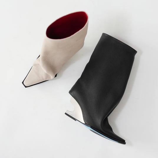 ■ヒールブーツは足首周りにボリューム感を持たせてメタルのヒールでモダンさを。