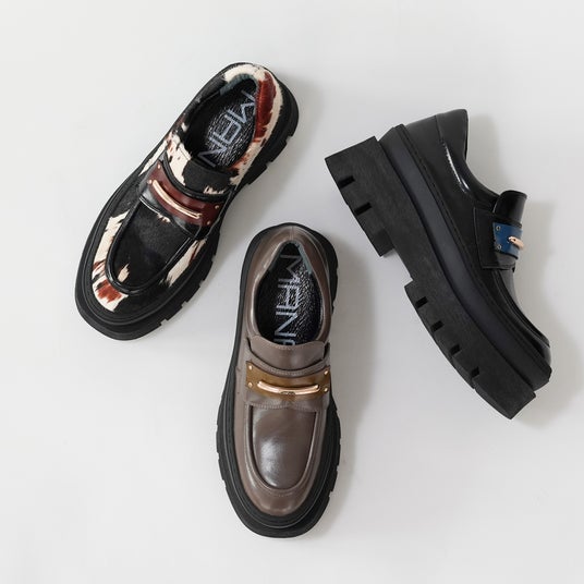 ■有機的でオーバーサイズなメタルパーツや天然ヘアカーフマテリアルを使うことで足元のインパクトを演出。