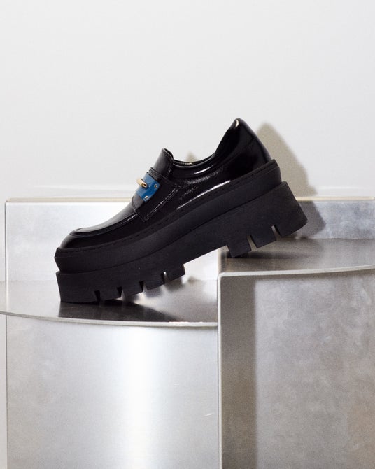 底材の存在感を放つボリューミィなシューズやブーツ。それに反して有機的メタルパーツやムートンファーをふんだんに使ったポインテッドフェイスのパンプスたち。相反する振り幅の異なる各アイテムを、エッヂを効かせながらそれぞれの個体の持つ力を強さと優しさを兼ね備えさせつつクリエーションしました。