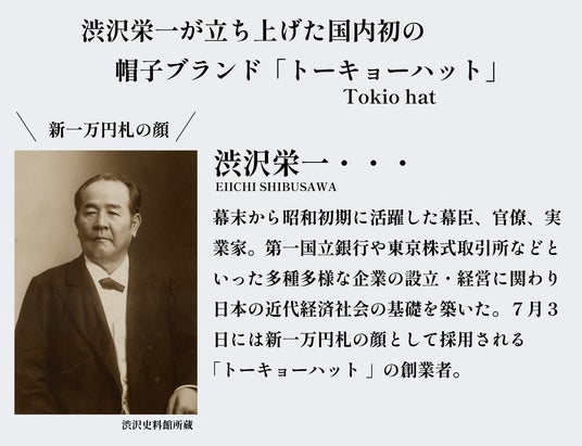 新一万円札の顔 渋沢栄一が立ち上げた国内初の帽子ブランド「Tokio hat(トーキョーハット)」。渋沢栄一の想いを受け継ぎ、今もなおその時代に応じたモノづくりにこだわり、130年以上の歴史を継承して帽子を作り続けております。