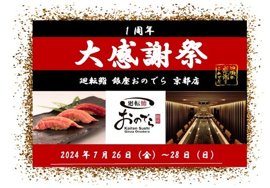 株式会社ONODERAフードサービス(代表取締役社長:小野寺 勇司 所在地:東京都千代田区)が運営する「廻転鮨 銀座おのでら 京都店」は、2024年7月26日(金)から7月28日(日)まで「1周年大感謝祭」を開催いたします。