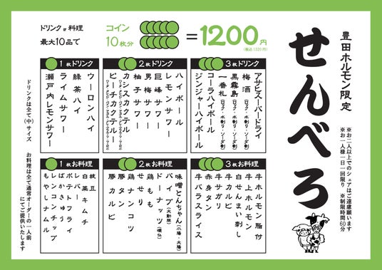 お客様に少しでも多くのメニューを楽しんでいただきたいと思いせんべろを企画しました。1,200円(税抜)でコインを10枚お渡しします。合計39種類のメニューの中から、コインと引き換えに注文ができます。メニューごとに交換できるコインの枚数が決まっており、1~3枚のメニューがございます。ドリンクは生ビールやレモンサワーなど合計で17種類、フードは様々なホルモンやおつまみが22種類ございます。また、お一人様1日1回限りの利用とさせていただいております。