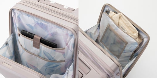 内装には、取り外して吊るすことができる「ハンギングポケットパネル」が付属しています。通常は中仕切りとして使用し、ホテルやお部屋では内装から取り外して洗面所やクローゼットなどにかけられる便利なアイテムです。下段のメッシュポケットは取り外して「メッシュポーチ」として単体でも使うことができ、衣類を入れておけばお部屋でサッと外して丸ごと洗濯することができます。他にも、小物の収納に便利な「マチ付きポケット」や中身が一目でわかる「シースルーポケット」といった、迷子になりがちな小物の収納に役立つ工夫が施されています。