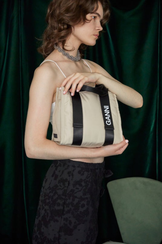 ハンドル部分にGANNIのブランドロゴが入ったアイコニックなデザインのミニトートバッグ。