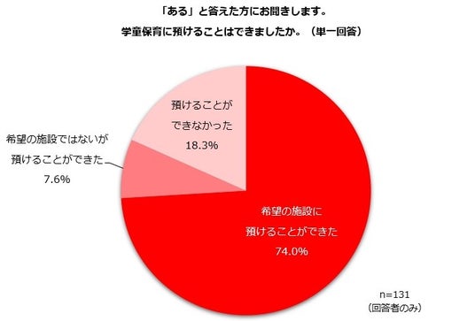 保育施設の整備が進む一方で、課題視されることが増えてきた学童保育。就労志向でお子さんがいる女性に「あなたは学童保育にお子さんを預けようとした経験はありますか」と尋ねたところ、38.4%の人が「ある」と答えました。あると回答した人に「学童保育に預けることはできましたか」と質問すると、「希望の施設に預けることができた」と回答した人が74.0%。一方「預けることができなかった」と答えた人も18.3%いました。保育園同様、学童保育の施設も整備が十分ではない様子が伺えます。
