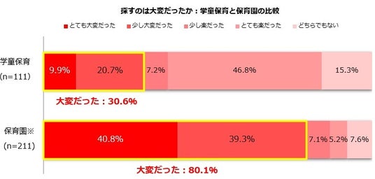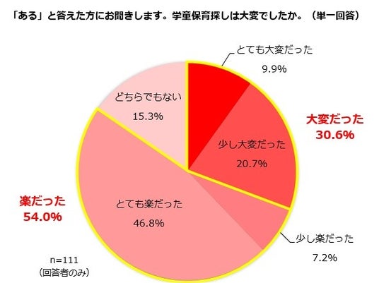 また、同じくあると回答した人に「学童保育探しは大変でしたか」と尋ねると、「大変だった」と答えた人が30.6%だったのに対し「楽だった」と答えた人は54.0%におよびました。以前、保活について調査した際には「大変だった」と回答した人が約8割だったのと比較すると学童保育探しの方が比較的取り組みやすさを感じている人が多いようです。地域によって違いがあるため一概には言えないものの、お子さんが大きくなっているため保育園探しの状況よりは比較的動きやすいことに加えて、学童保育は小学校の敷地内に設置されていたり保育園から持ち上がりのケースもあるといった事情が関係しているのかもしれません。
