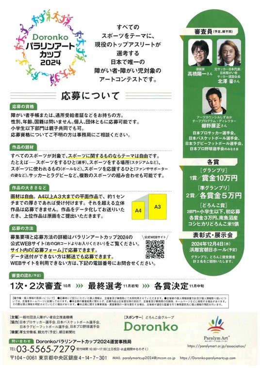 一般社団法人障がい者自立推進機構 パラリンアート運営事務局(所在地 : 東京都港区、代表理事 : 松永 昭弘 以下、パラリンアート)はゴールドパートナー契約を締結した、「インクルーシブ保育のフロントランナー」として走り続けるどろんこ会グループ(本社:東京都渋谷区理事長:安永愛香/代表:高堀雄一郎)とともに、現役のプロアスリートが選考する唯一の障がい者・障がい児のアートコンテストである「パラリンアートカップ 2024」を開催いたします。