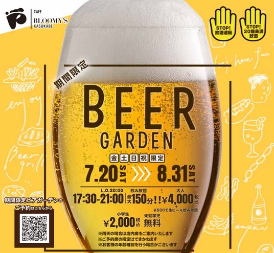 冠婚・葬祭・互助会を柱とした総合結婚式場・葬斎センター・多目的ホールを展開するアルファクラブ武蔵野株式会社(本社:埼玉県さいたま市 代表取締役社長 和田浩明)が運営する、CAFE BLOOMY’S KASUKABE (カフェブルーミーズカスカベ、以下 当カフェ) では、2024年7月20日(土)~8月31日(土)の期間中、金・土・日・祝限定でビアガーデンを開催いたします。ご利用には予約が必要となります。ビアガーデン詳細をご確認ください。