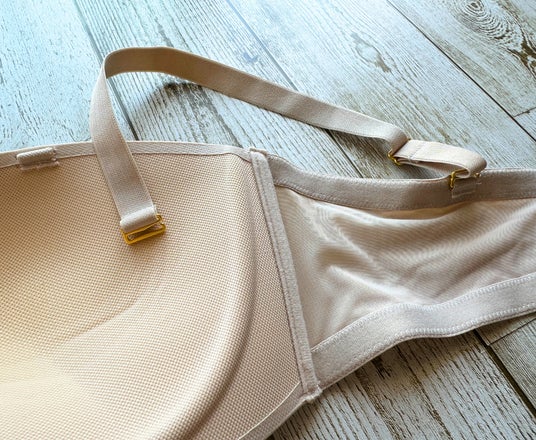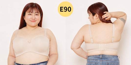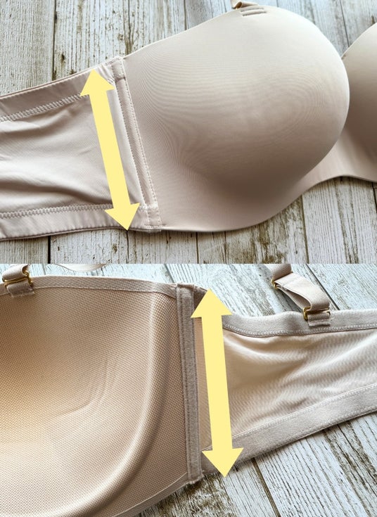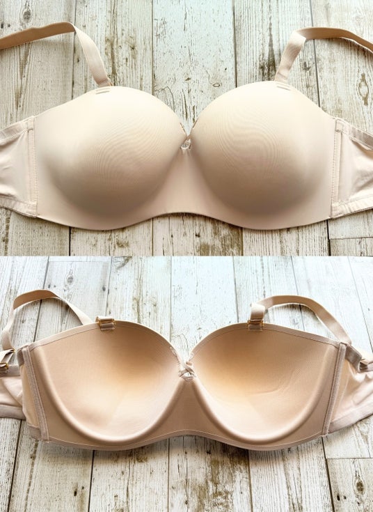 左と右のカップが繋がって一つになっているのでズレにくいんです。ストラップレスで着用しても安定感があります。
