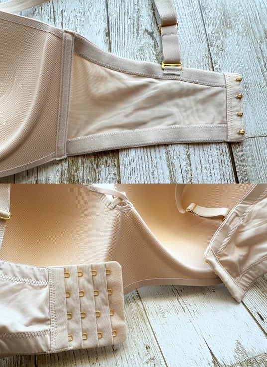 着け心地がとても良く、シンプルで白いTシャツにも透けなかったです☆ストラップを外すと、安定感がなく落ちてきてしまうのかなぁと思っていましたがこのブラは四段ホックでしっかりホールドしてくれて、落ちてくる心配はありませんでした☆