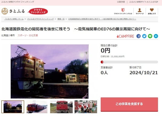 北海道小樽市とふるさと納税ポータルサイト「さとふる」を運営する株式会社さとふる(本社:東京都中央区、代表取締役社長 兼 CEO:藤井 宏明)は、「さとふるクラウドファンディング」にて、「北海道国鉄電化の開拓者を後世に残そう ~電気機関車のED76の展示再開に向けて~」の寄付受け付けを2024年7月22日より開始します。