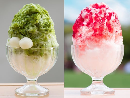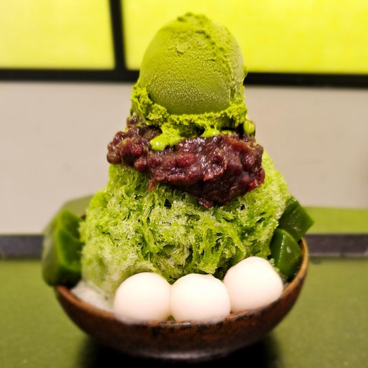 京菓子の老舗「笹屋伊織」がプロデュースする和カフェ〈イオリ〉。オリジナル抹茶アイス・抹茶ゼリー・白玉が入ったスペシャルなかき氷です。/地1階 和菓子売場 ※9月下旬まで