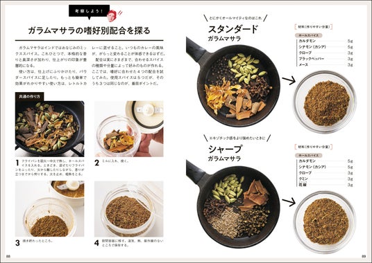 「加熱しない場合、スパイスの特徴はどこまでいきる?」「ハーブオイルに向くハーブは何だ?」「ガラムマサラの嗜好別配合」など、実験を交えてボリュームたっぷりに解説しています。