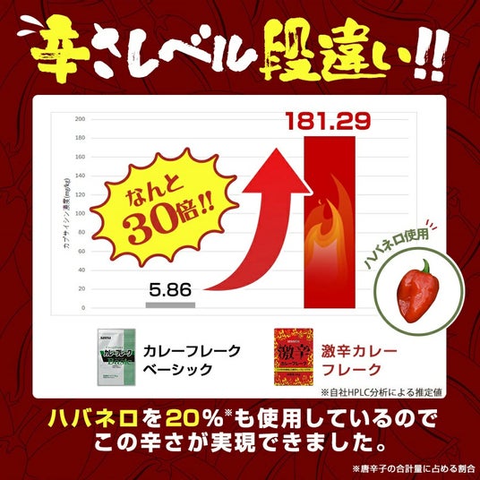 ハバネロなどを使い、カプサイシン(辛み成分)の量が、SPANION「カレーフレーク」の30倍の量になるように調整しました。ちなみに、発売前の社内試食会では、辛さに耐性のあるスパイス会社の社員が、涙目で「やりすぎ!」と悶絶する騒ぎに。