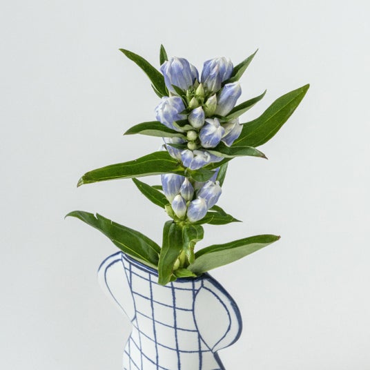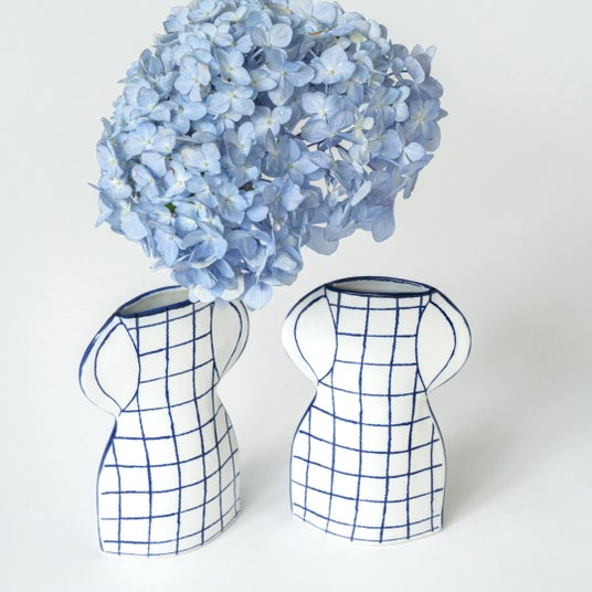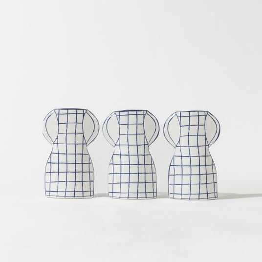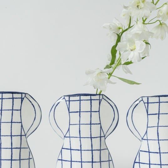 チェックのかびん(FP2・seto)高さ約16センチ、一輪でも、小さな花束でも生けられる、場所に困らないサイズです。「チェック」はマリアンヌがずっと好んでいるモチーフです。