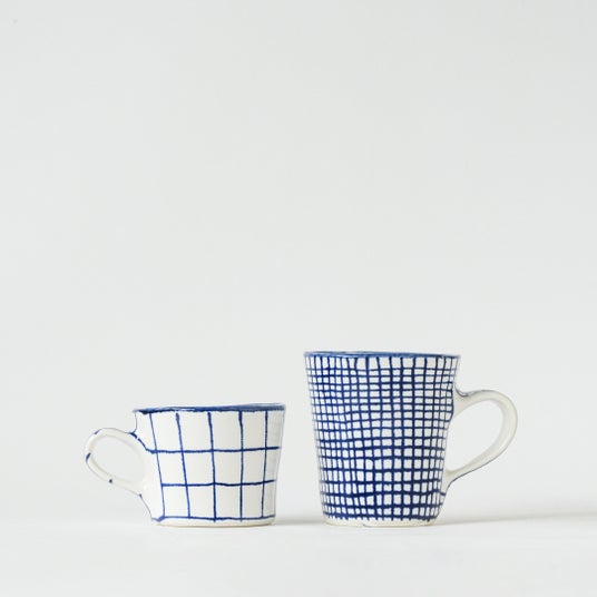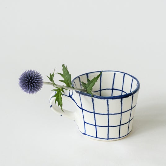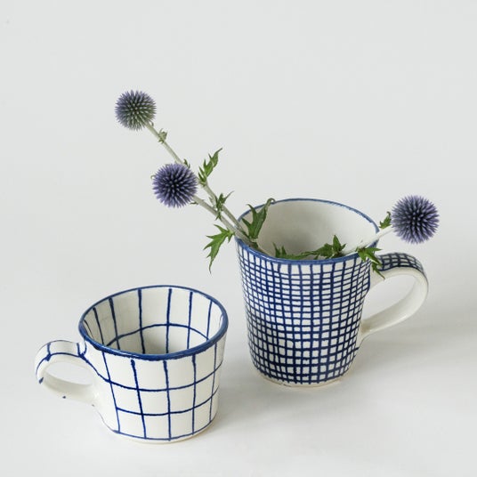 チェックのカップ(seto)マリアンヌの傑作「チェックのカップ(seto)」です。内側にも柄が描かれているので、飲み物をいれると揺らぐ模様がユニーク。