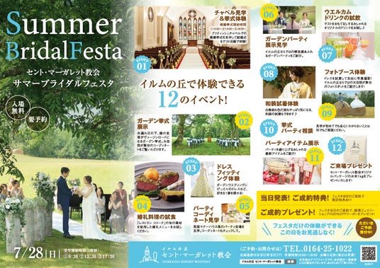 深川市の結婚式場・イルムの丘 セント・マーガレット教会(株式会社あいプラン)では、7月28日(日)に1日限定の「サマーブライダルフェスタ」を開催します。夏の北海道ウエディングを体験できる、イルムの丘 セント・マーガレット教会だけの特別なブライダルフェアです。