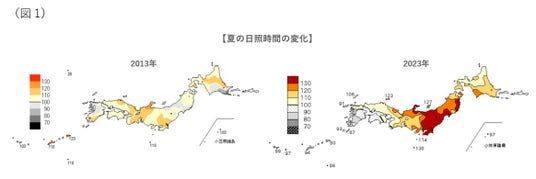 ※2013年6月~8月、2023年6月~8月の日照時間平均比