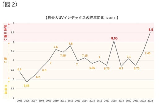 私たちが1年間に浴びる紫外線量は年々増え続けており、10年あたり4.6%ずつ増加していることがわかっています。特に近年の夏は、気温の上昇だけでなく日照時間も長くなり(図1)、降り注ぐ紫外線の強さも増しているため、夏の紫外線が人体や肌に及ぼす影響は、以前よりも高くなっています(図2)。