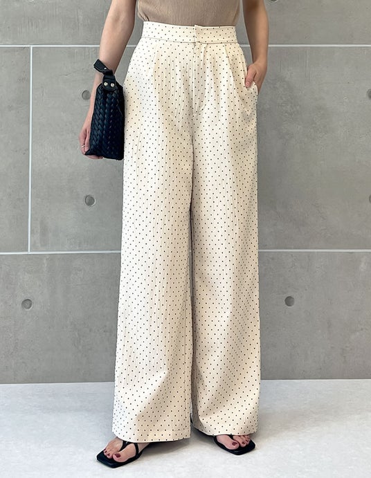 大人の女性も挑戦しやすい、さりげないフロッキードットパンツは、コーデのアクセントにもぴったり。