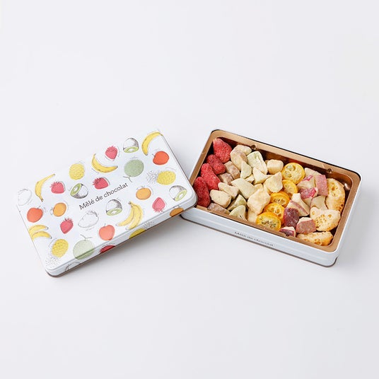 ストロベリー、バナナ、キウイ、金柑たまたま、アップル、マンダリン、メロンを彩りよくアソートしました。7種のしみこみショコラが楽しめ可愛いイラスト缶はプレゼントにおすすめです。