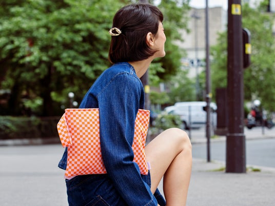 オレンジとピンクのコントラストが目を引く、ニット素材の大きめクラッチバッグ。バッグの内側はライトブルーで、爽やかな色合いがポイントです。きれいめでも、カジュアルなファッションにもマッチします。ごろっとした丸みのあるヘアバレッタは、髪にひとつ飾るだけで瞬間トレンドスタイルに。