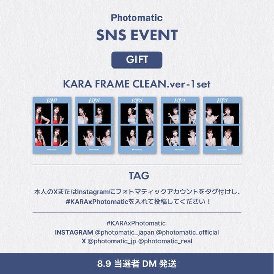 上記期間中に、XまたはInstagramで、Photomatic公式アカウントをメンションし、「#KARAxPhotomatic」 のハッシュタグを付けて投稿してください。
