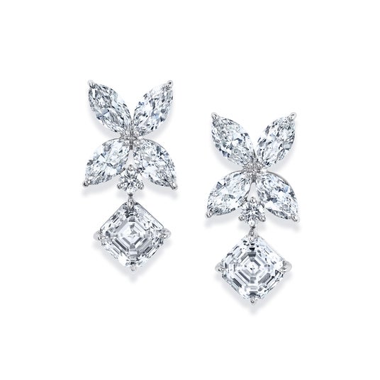 併せて発表されるピアスは、メインに飾られた「ロイヤル・アッシャー・カット」が、葉や花を連想させる4石のマーキースカットのダイヤモンドとともに、洗練された美しさを放ちます。