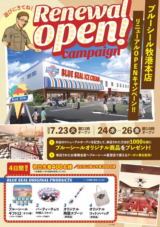 フォーモストブルーシール株式会社(本社:沖縄県浦添市、代表取締役社長:村上琢磨)は、2024年7月23日(火)に「ブルーシール 牧港本店」をリニューアルオープンいたしました。