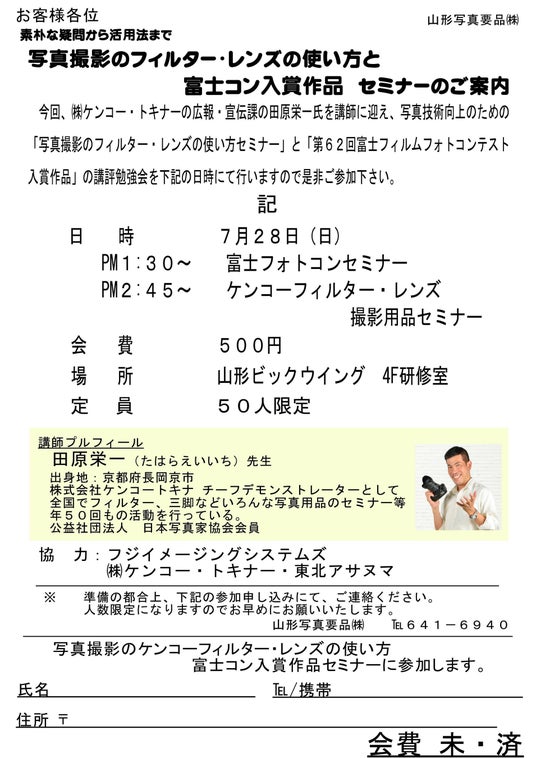 株式会社ケンコー・トキナー(本社:東京都中野区、代表取締役社長:山中 徹)は、山形写真要品株式会社(山形県山形市)が主催するセミナーに講師を派遣し、広くフィルターおよび三脚、さらにトキナーレンズやレンズベビーなどの活用術を広めて参ります。