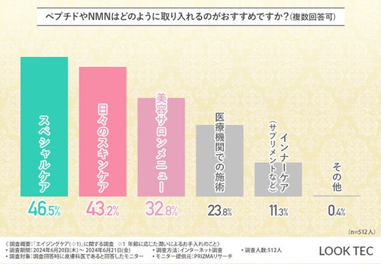 続いて、「ペプチドやNMNはどのように取り入れるのがおすすめですか?(複数回答可)」と質問したところ、『スペシャルケア(46.5%)』と回答した方が最も多く、次いで『日々のスキンケア(43.2%)』『美容サロンメニュー(32.8%)』と続きました。
