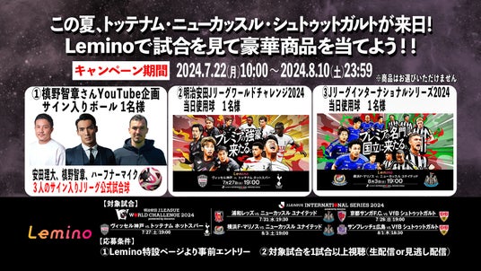 そして、Leminoでは「明治安田Jリーグワールドチャレンジ2024 powered by docomo」、「Jリーグインターナショナルシリーズ2024 powered by docomo」の配信を記念し、2024年7月22日(月)より「今年の夏はLeminoでプレミアリーグ・ブンデスリーガを楽しもうキャンペーン」を開始いたしました。安田理大さん、槙野智章さん、ハーフナーマイクさんのサイン入りボールや、本大会で実際に使用された公式試合球がもらえる貴重な機会ですので、ぜひご参加ください。