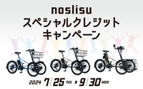 株式会社カワサキモータースジャパン(本社:兵庫県明石市、代表取締役社長:佐伯 健児)は、noslisu取扱店でnoslisu(電動アシスト自転車)またはnoslisu e(フル電動仕様)の新車ご購入時に実質年利2.2%でご利用いただける、「noslisuスペシャルクレジットキャンペーン」を2024年7月25日から実施いたします。
