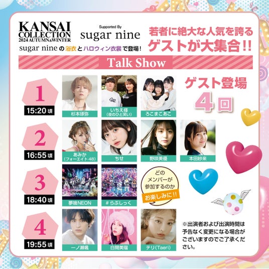 モデルの枠にとどまらずドラマ主演やバラエティ番組でも活躍をみせる鈴木愛理や大友花恋。カジサックこと梶原雄太の長女であり、今年芸能界デビューを果たした梶原叶渚。自身で手掛けるコスメブランドも大人気の吉田朱里。今年4月にAKB48を卒業した柏木由紀。ボーイズグループM!LKメンバーの曽野舜太。フィギュアスケート選手としても活躍する本田紗来。「おさみみ」の愛称でZ世代から支持を集める仲良しコンビおさき&MINAMIや夜のひと笑い、ヘラヘラ三銃士など、今大人気のタレントやクリエイターが最新の秋冬ファッションを披露します。