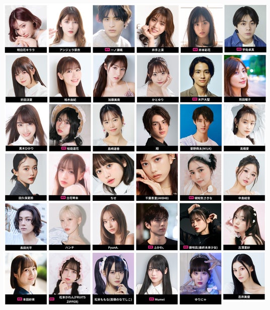 明日花キララ、アンジェラ芽衣、一ノ瀬颯、井手上漠、井本彩花、宇佐卓真、折田涼夏、柏木由紀、加藤美南、かとゆり、木戸大聖、熊田曜子、黒木ひかり、桜庭遥花、島崎遥香、翔、曽野舜太(M!LK)、