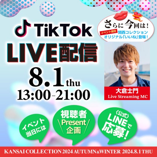 さらに、約7時間に達するイベントの全貌を伝えるTikTokライブ配信のLive Streaming MCを務める大倉士門が、特別ゲストとの貴重なトークを交えながら、全世界に関西コレクションの熱狂をお送りします。