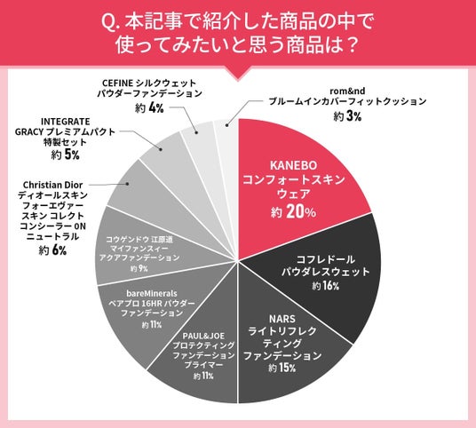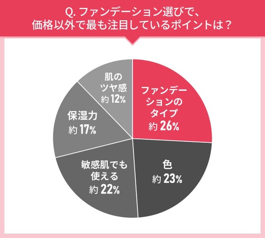 ファンデーションのタイプ、色、敏感肌でも使えるかどうかを気にしている人が多いようです。一方、保湿力や肌のツヤ感は一段トーンが落ちる結果となりました。