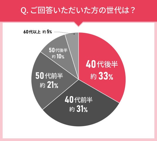 今回の回答者は40代の回答者が全体の約64%、50代の回答者が約31%、60代以上が約5%。肌質としては水分が量少なく、皮脂量多い混合肌が多い結果となりました。また、肌の悩みとして「毛穴が目立つ」「目元や口元の乾燥」と答える人が全体の約65%いました。加齢とともに肌が水分を保持しにくくなり、皮脂も多くなってくる年代らしい回答になりました。
