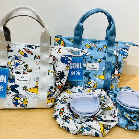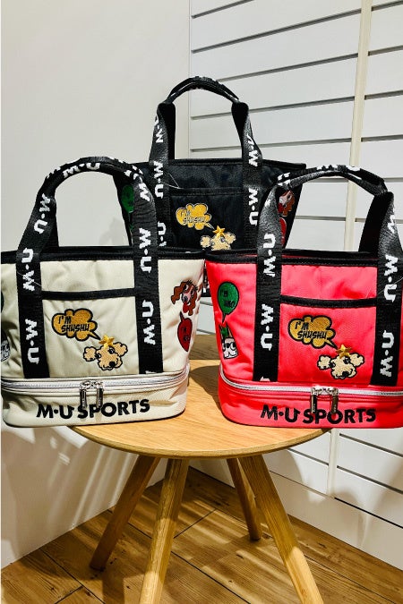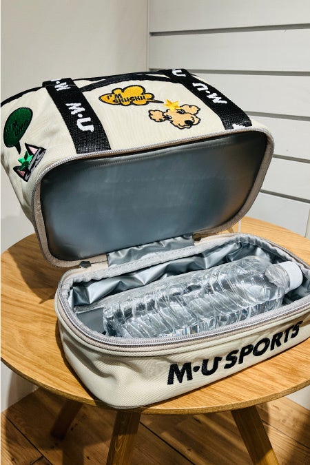 〈M・U スポーツ〉らしいキャラクター大集合のかわいいデザイン。上段は普段使いの小物収納に。下段は550mLのペットボトル2本収納可能の保冷裏地付き仕様。ゴルフでもレジャーでも活躍すること間違いなし!!