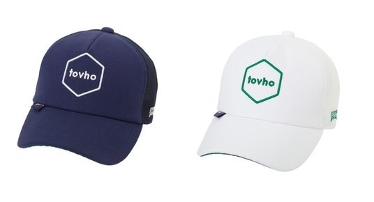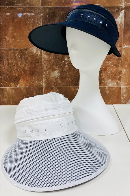 ポリエステルとメッシュの組合せの2Wayジョッキーハット。トップが取外し可能でサンバイザーとしても使えます。帯のラインストーンロゴがポイントでつば周りと後ろのゴムにもラメを効かせ華やかさを演出。夏のゴルフをオシャレに快適に乗り切るアイテム!