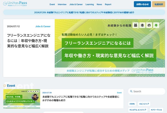 で構成し、未経験エンジニアからニーズが高い情報はもちろんのこと、トップエンジニアインタビューや、ユニタス経由でエンジニアデビューを果たした求職者、そして、未経験エンジニア向けオンラインセミナーなど、ユニタスだからこそ、用意できるコンテンツも充実していきます。
