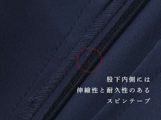 股下の内側には裂けないように「スピンテープ」と呼ばれる伸縮性のある紐を縫い合わせています。