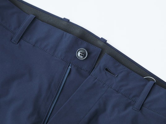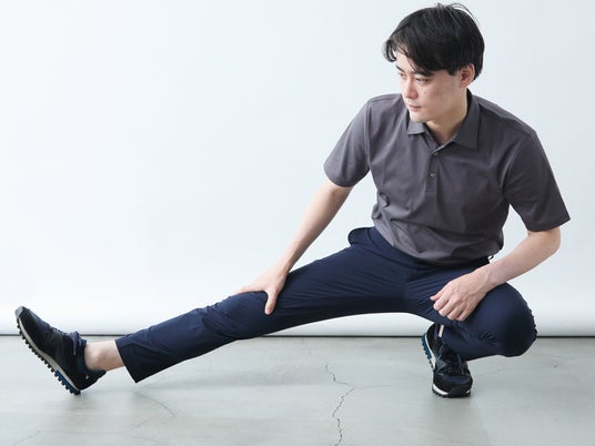 3Dパターンと縫製、そして適度に伸縮する素材の掛け算によって、かがんで靴ひもを結ぶ姿勢もラクチンです。