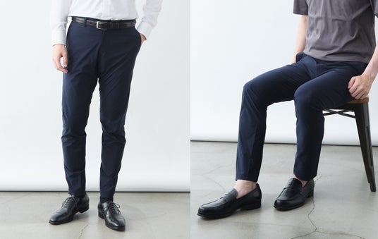 着席する際は、「膝の生地をつまんで座る」というケースがほとんどですが、このパンツではそれが不要。