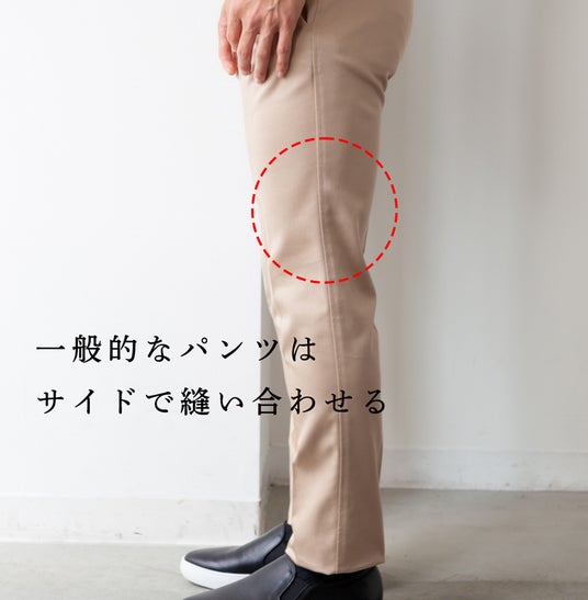 つまり、1枚の生地を「筒状」に縫製し立体的に加工を施すことで、脚の形に仕上げているのがこのパンツ最大の特徴です。