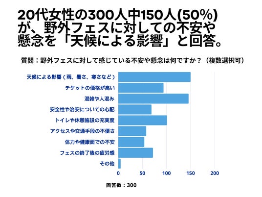 20代女性の300人を対象とした「野外フェスに対して感じている不安や懸念は何ですか?」というアンケートで150人(50%)が「天候による影響(雨、暑さ、寒さなど)」という結果になりました。