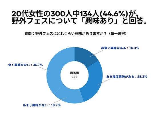 20代女性の300人を対象とした「野外フェスにどれくらい興味がありますか?」というアンケートで134人(44.6%)が「野外フェスについて興味あり」という結果になりました。