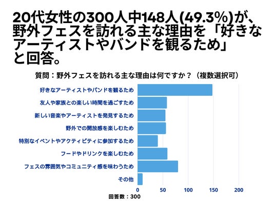 20代女性の300人を対象とした「野外フェスを訪れる主な理由は何ですか?」というアンケートで148人(49.3%)が「好きなアーティストやバンドを観るため」という結果になりました。