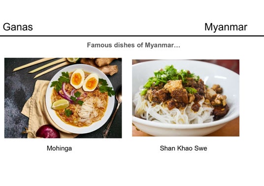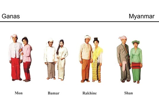 左)ミャンマーは多民族国家、衣装も様々 右)ミャンマーの麺類の紹介